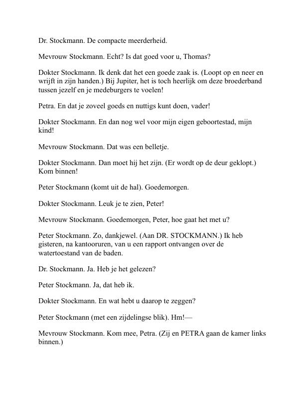 Aan het begin van het stuk maken we kennis met Dr. Stockmann in zijn huis, waar hij een maaltijd deelt met zijn familie en vrienden. Dit schetst een levendig huiselijk tafereel.