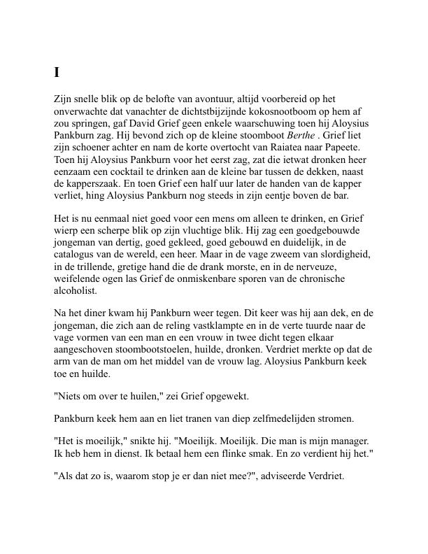Het verhaal belooft thema’s als avontuur, conflict en de dualiteit van beschaving en wreedheid, terwijl het Griefs interacties met verschillende eilandbewoners en andere personages verdiept. De opening van het boek introduceert de “Willi-Waw”, een handelsschip dat voor anker ligt in een afgelegen passage begrensd door koraalriffen. Hier ontmoeten we Griffiths, de kapitein van het schip, en zijn maat Jacobsen, die hun frustratie uiten over de drukkende hitte en een dreigende financiële verplichting aan de raadselachtige David Grief. Het hoofdstuk zet een gespannen toon terwijl Griffiths zich voorbereidt om zijn schulden en de gevolgen van zijn keuzes onder ogen te zien, en voorspelt met name een conflict met Grief, die bekendstaat om zijn scherpzinnigheid en financiële inzicht.